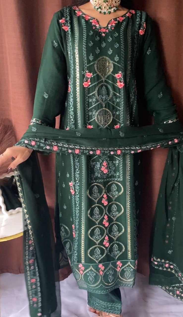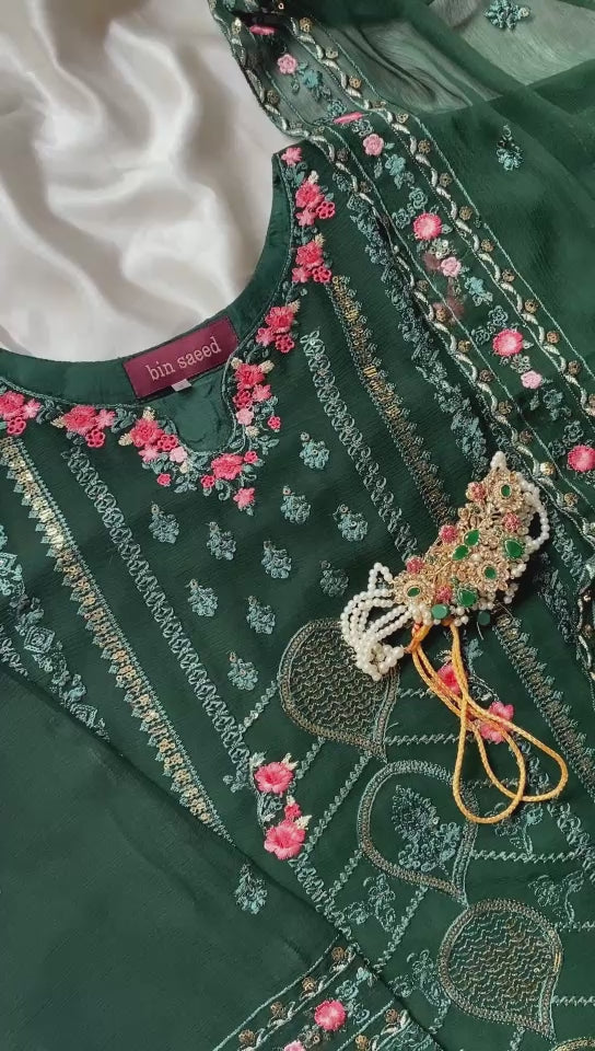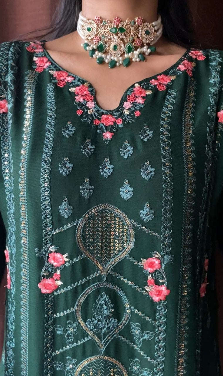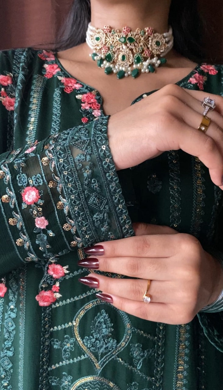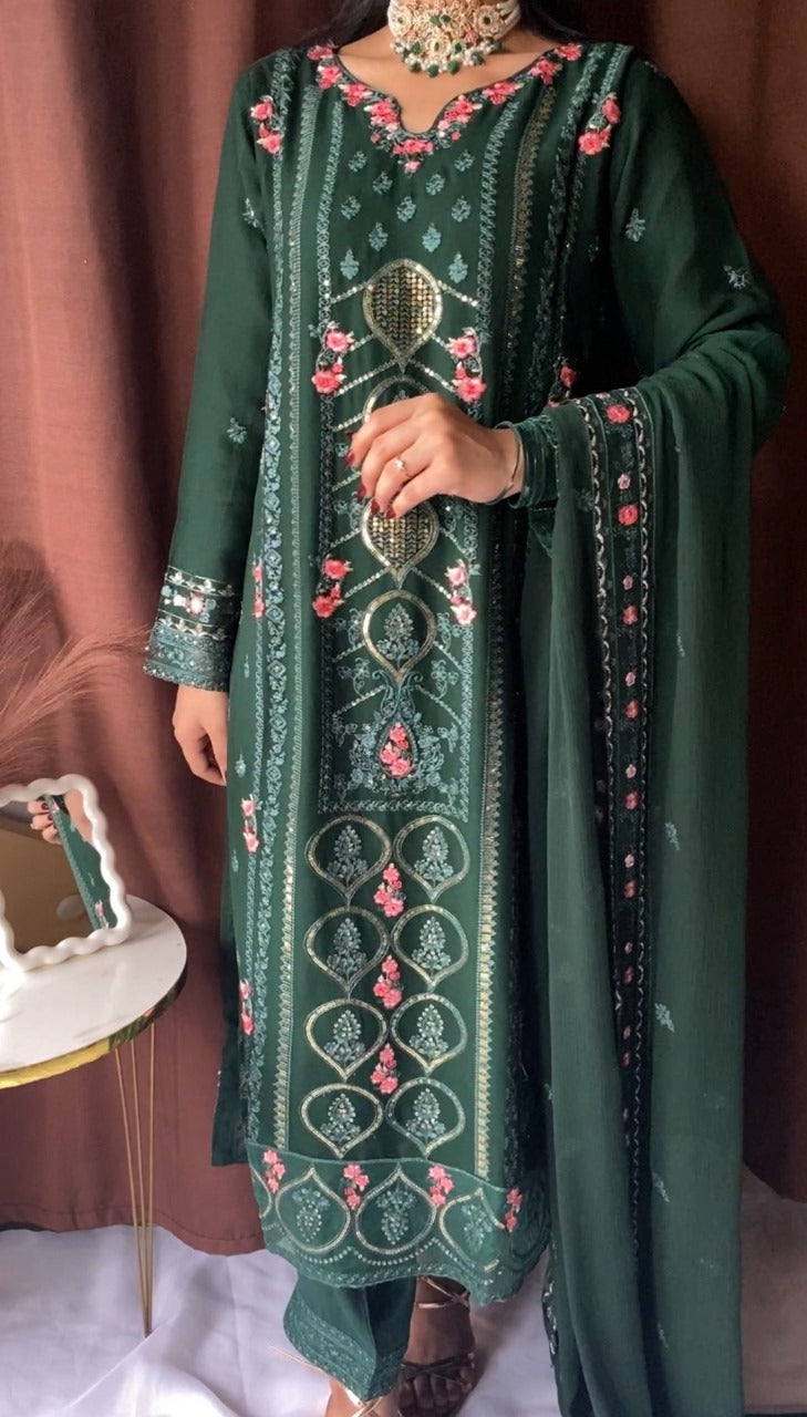 Shirt: Elegant Green chiffon with intricate thread embroidery, delicate sequins, and beadwork on neckline, sleeves, and hemline. Finished with lace detailing for a luxurious touch.