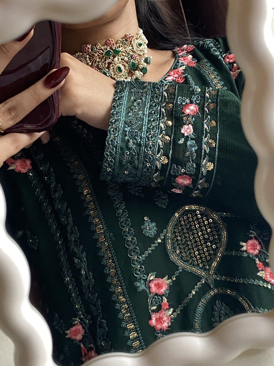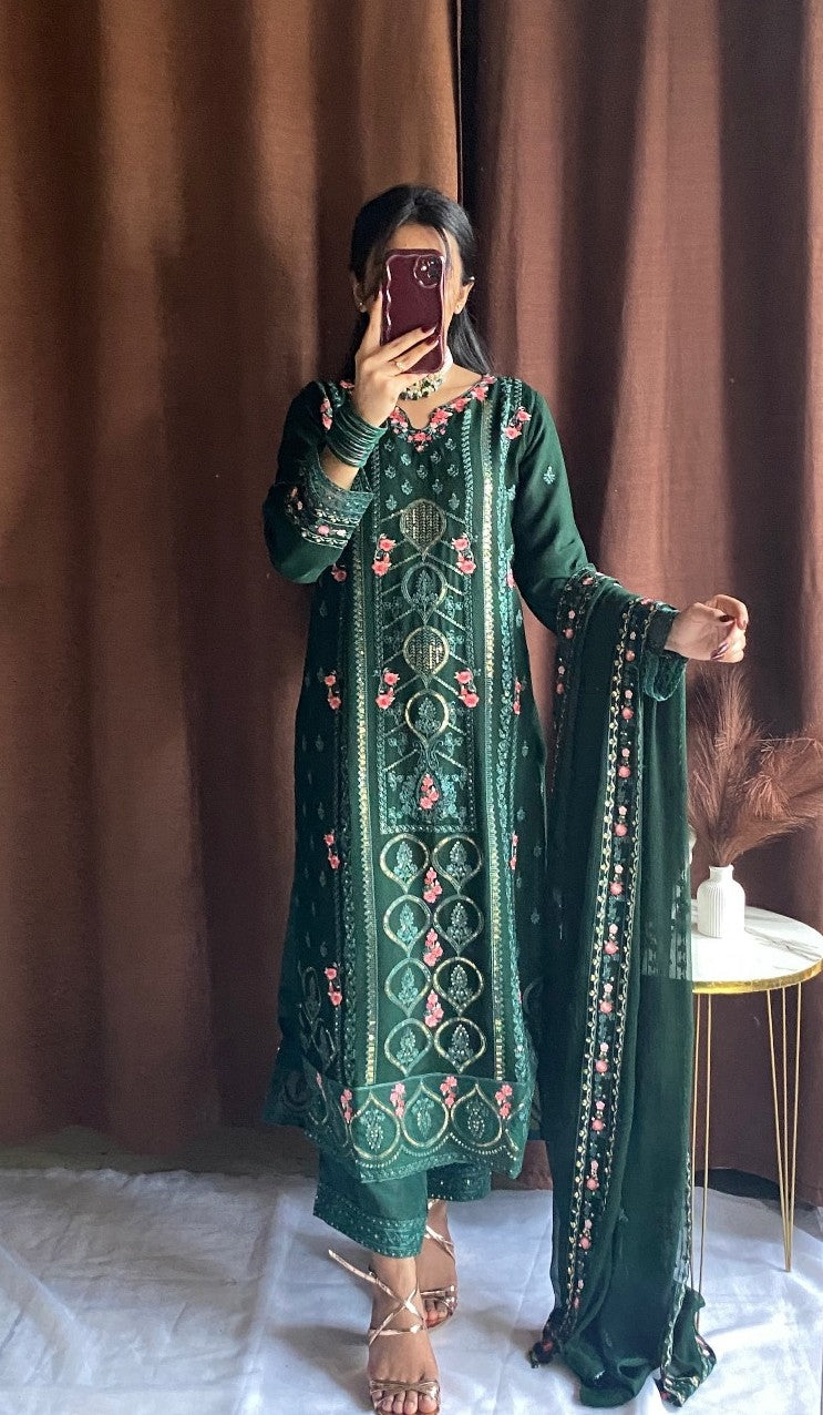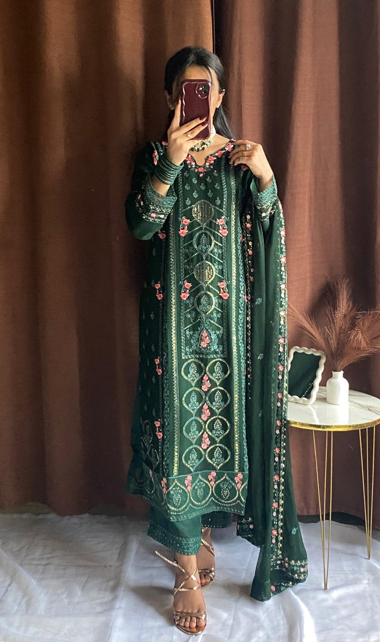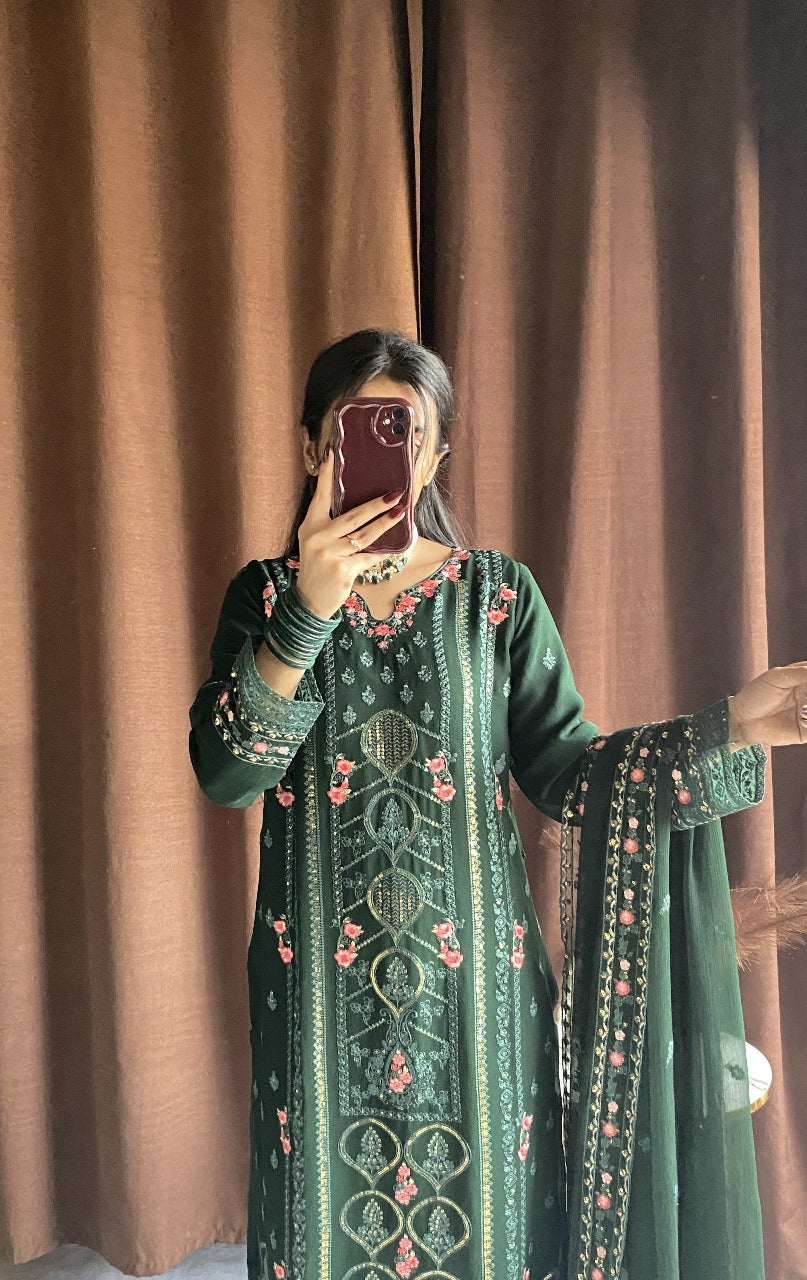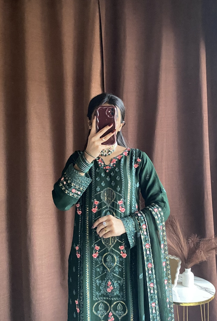 Shirt: Elegant Green chiffon with intricate thread embroidery, delicate sequins, and beadwork on neckline, sleeves, and hemline. Finished with lace detailing for a luxurious touch.