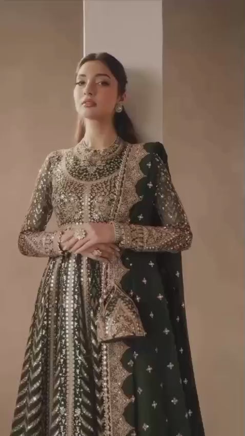 Make a regal statement with this exquisitely designed dark green Anarkali gown, featuring intricate hand embroidery, sequins, and mirror work. The ensemble is crafted from premium quality net fabric and adorned with golden threadwork to create an elegant and timeless appeal.