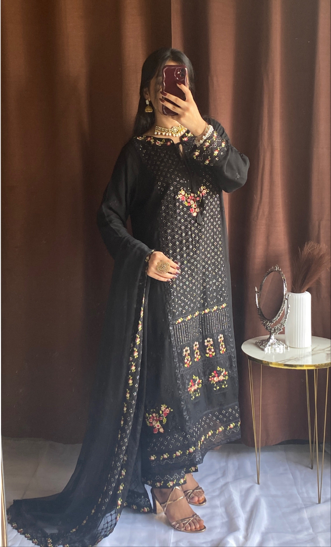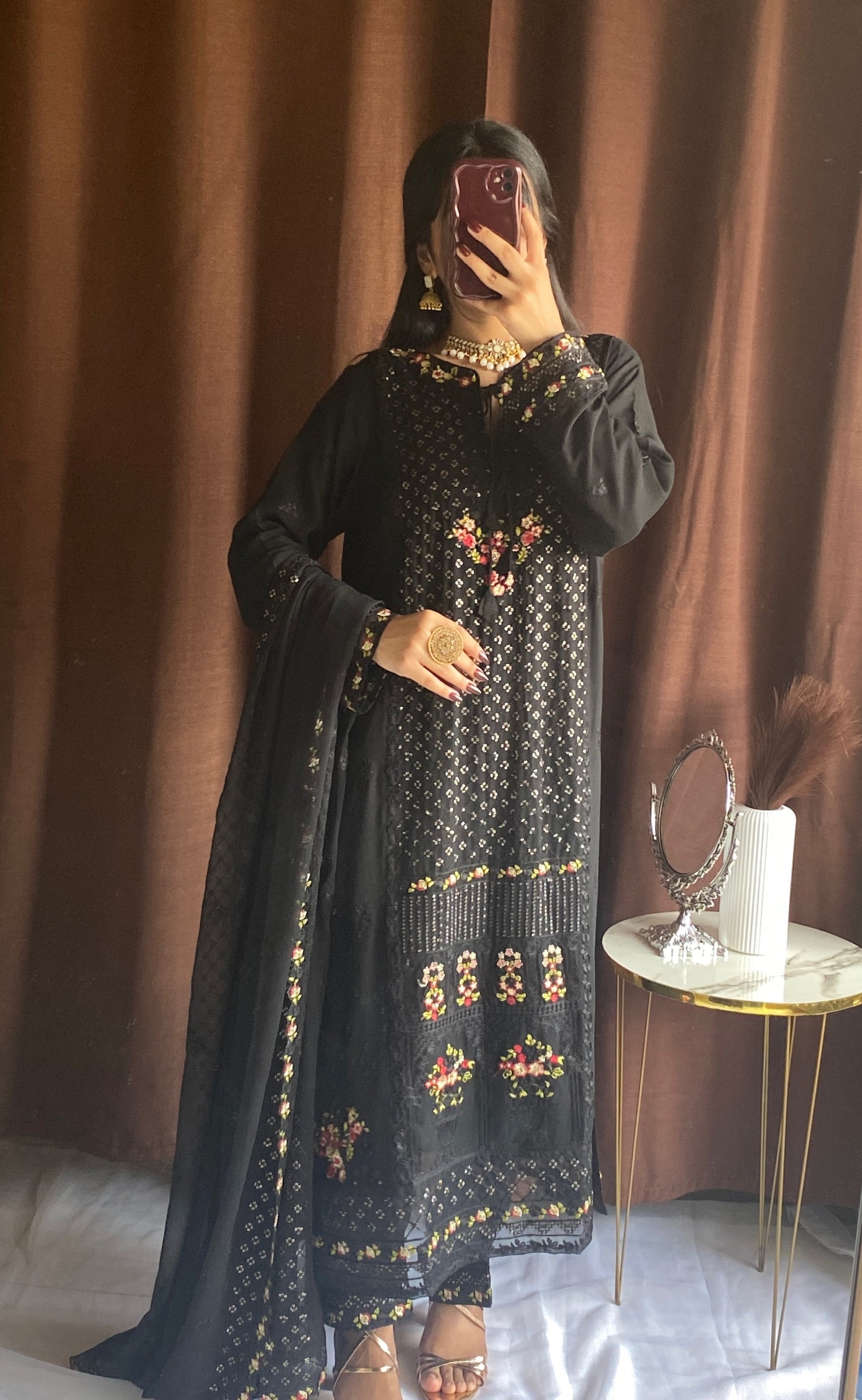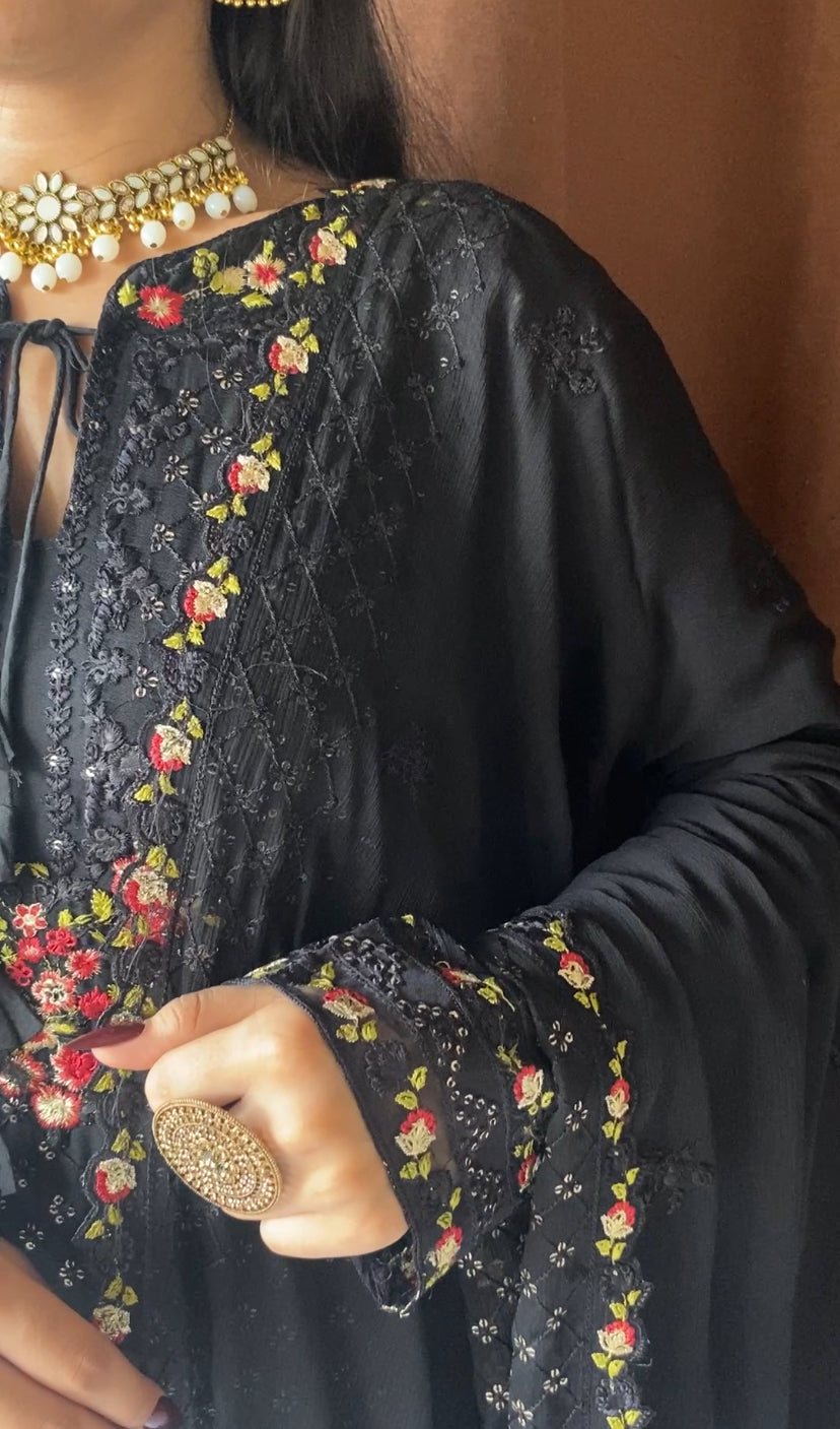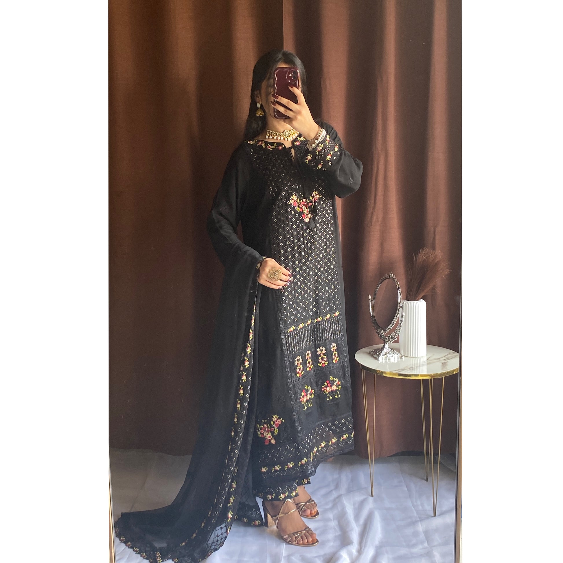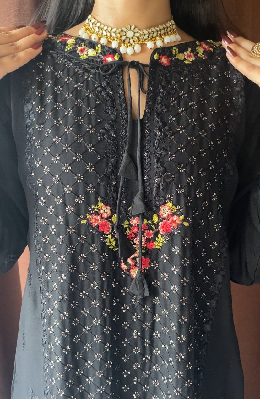 Shirt: Elegant Black chiffon with intricate thread embroidery, delicate sequins, and beadwork on neckline, sleeves, and hemline. Finished with lace detailing for a luxurious touch.