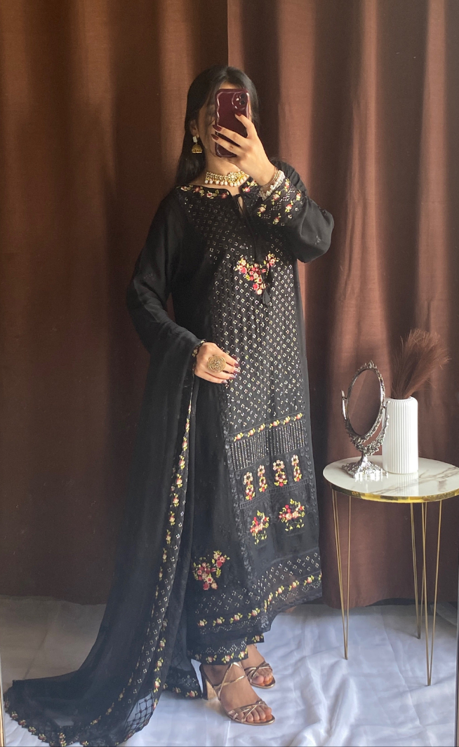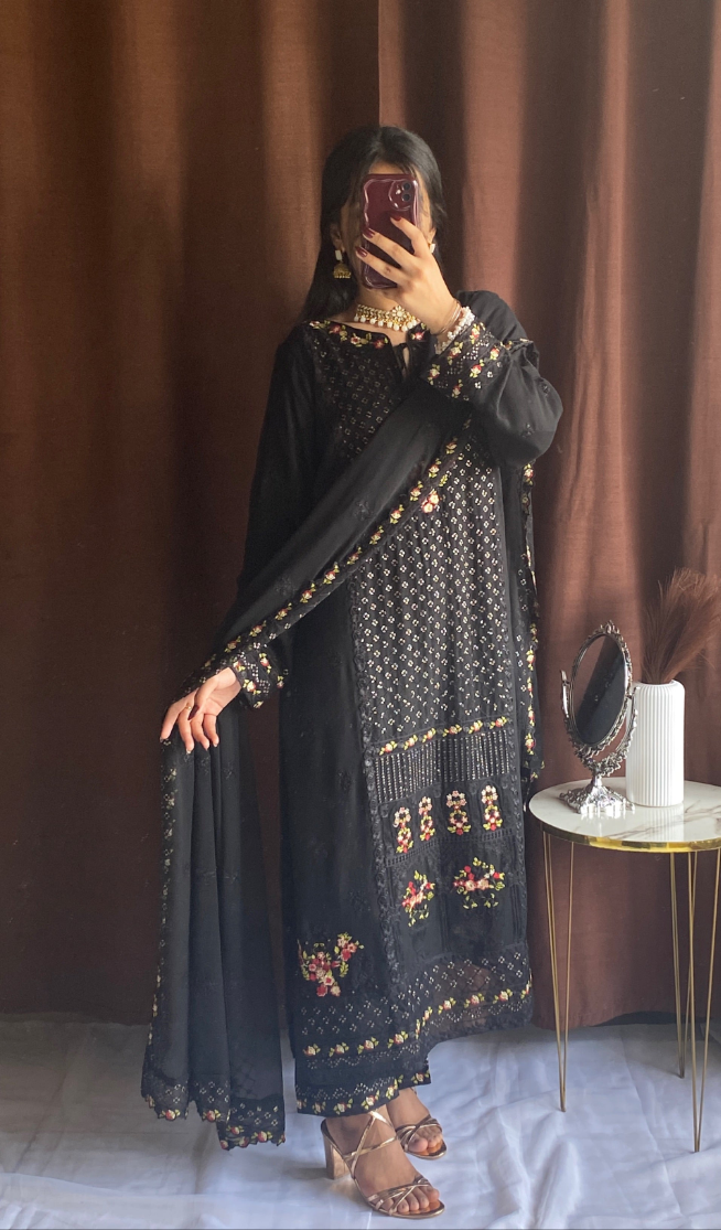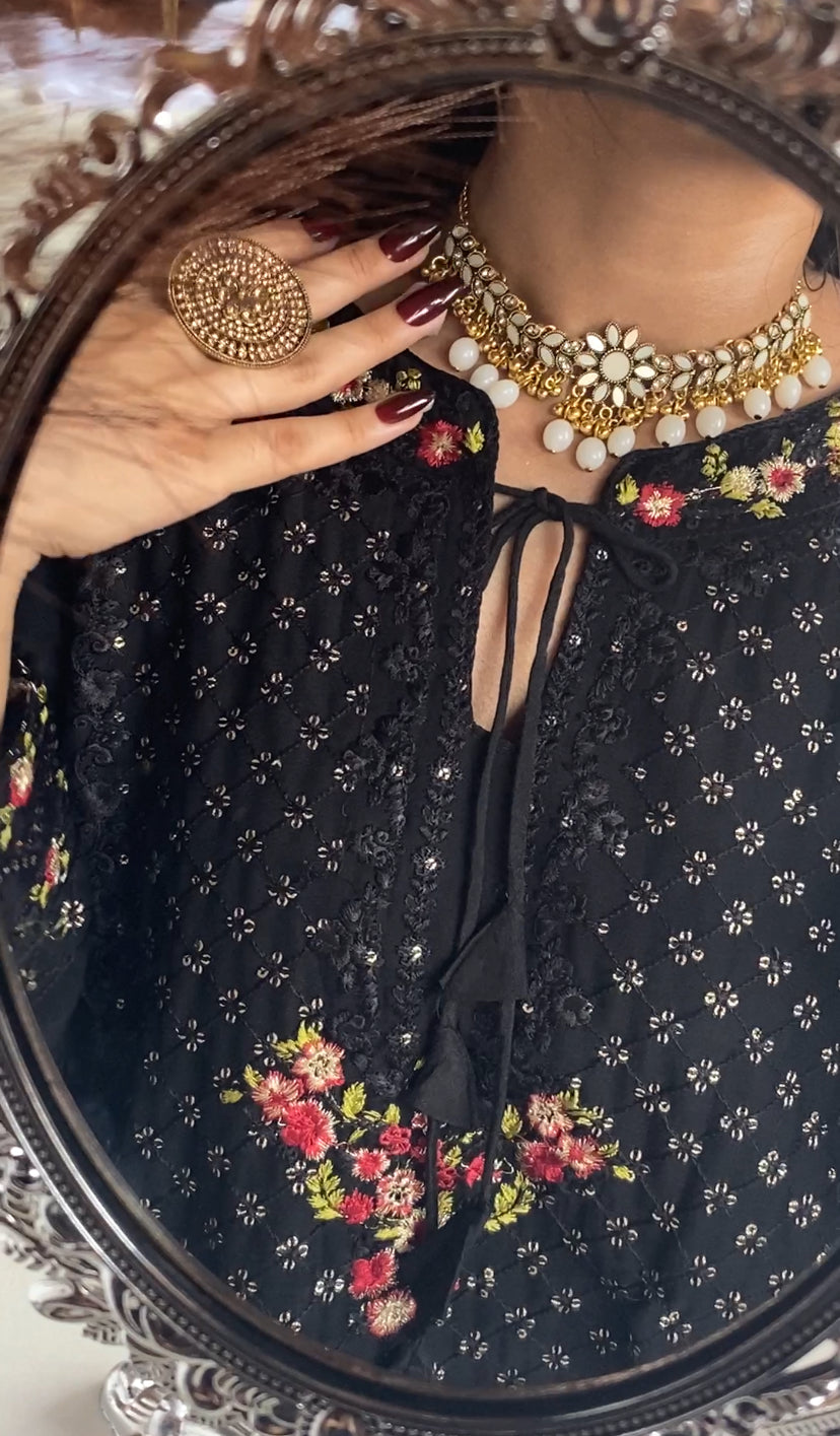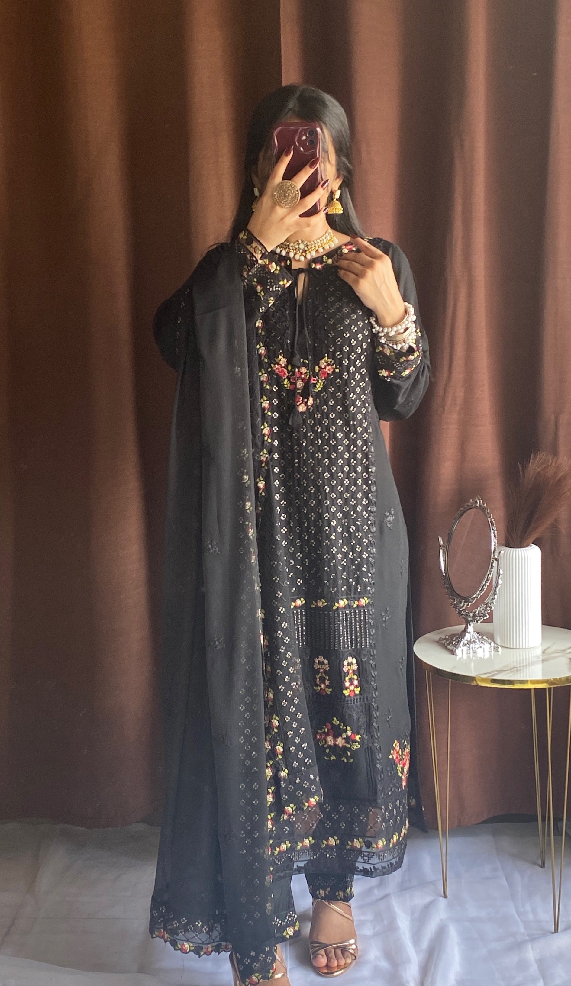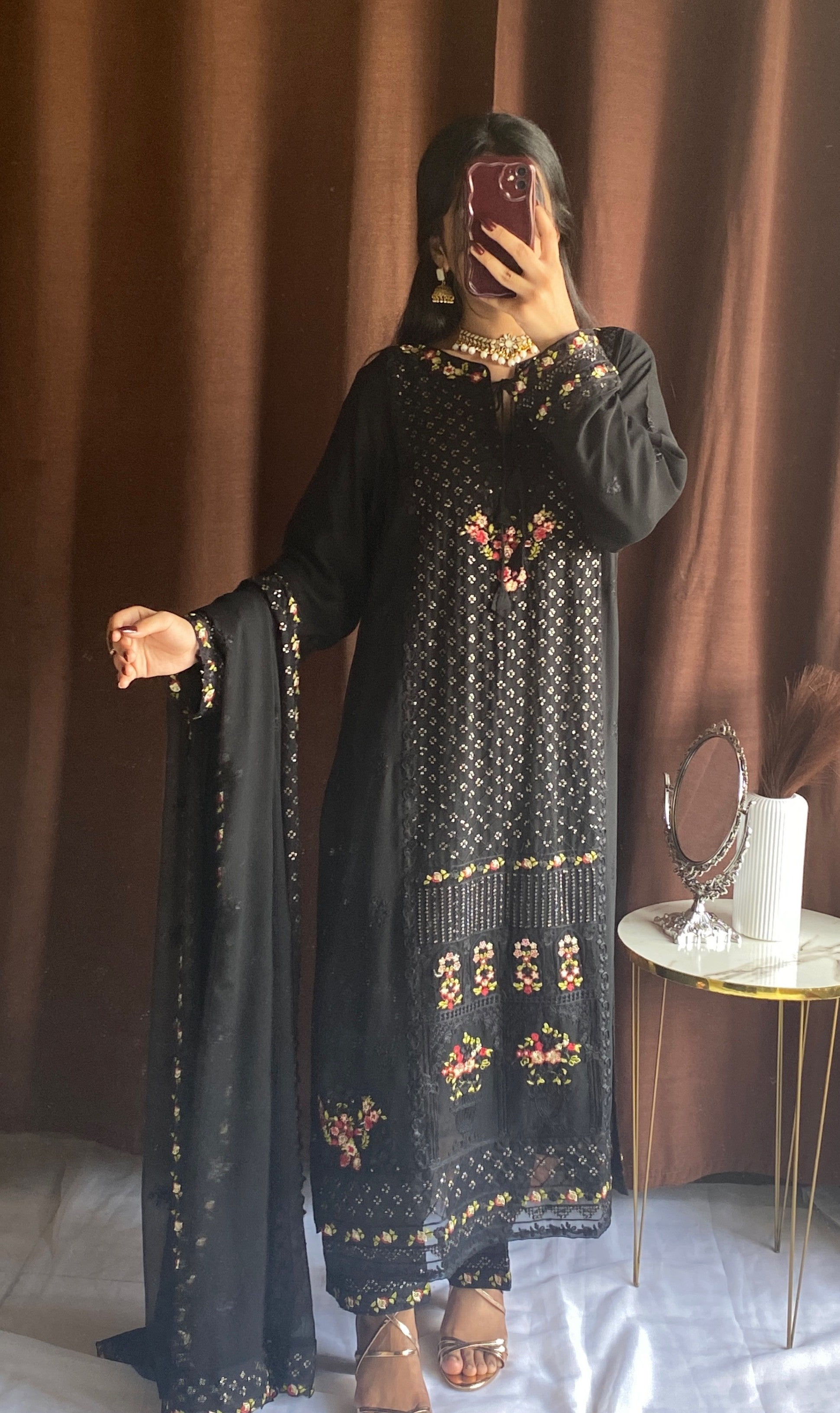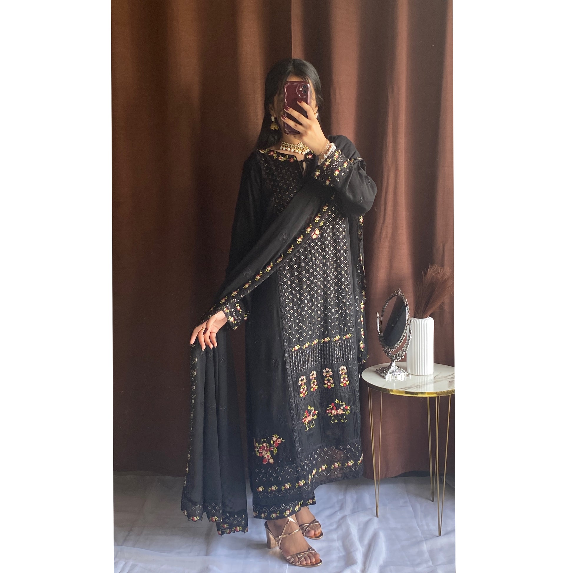 Shirt: Elegant Black chiffon with intricate thread embroidery, delicate sequins, and beadwork on neckline, sleeves, and hemline. Finished with lace detailing for a luxurious touch.
