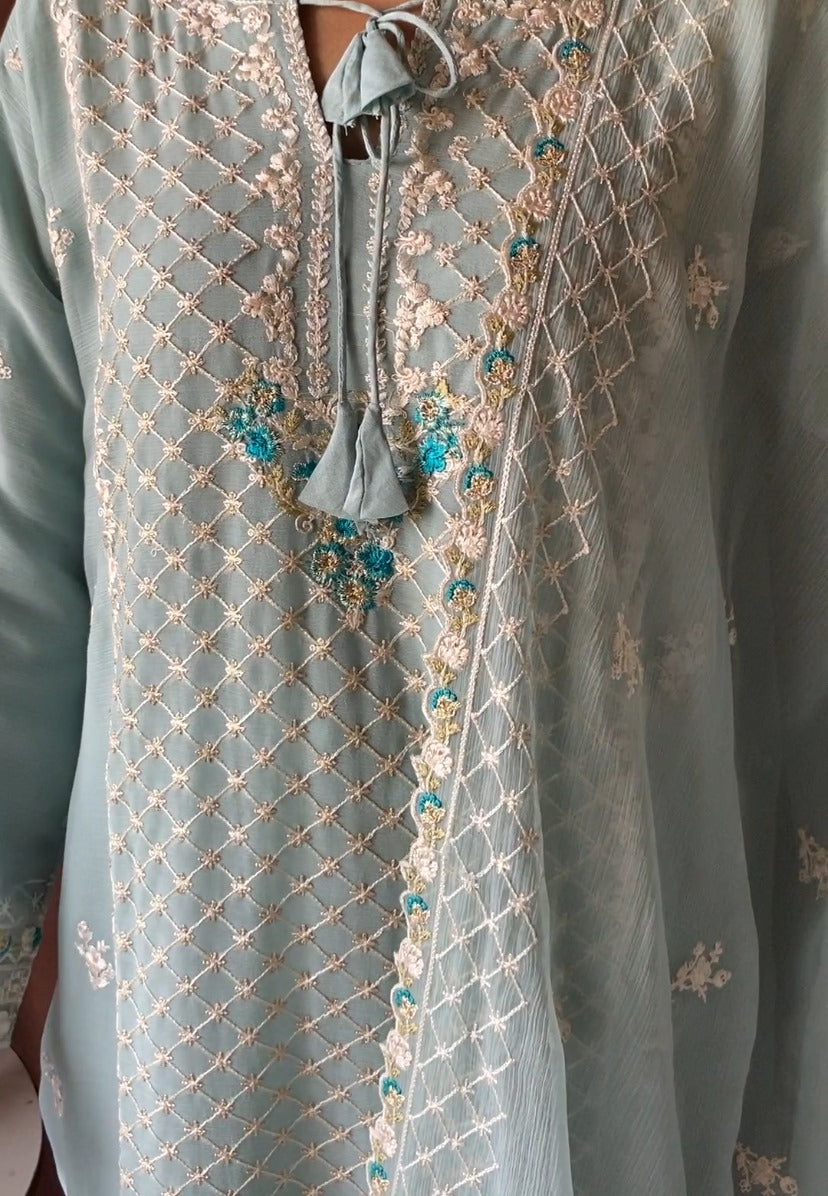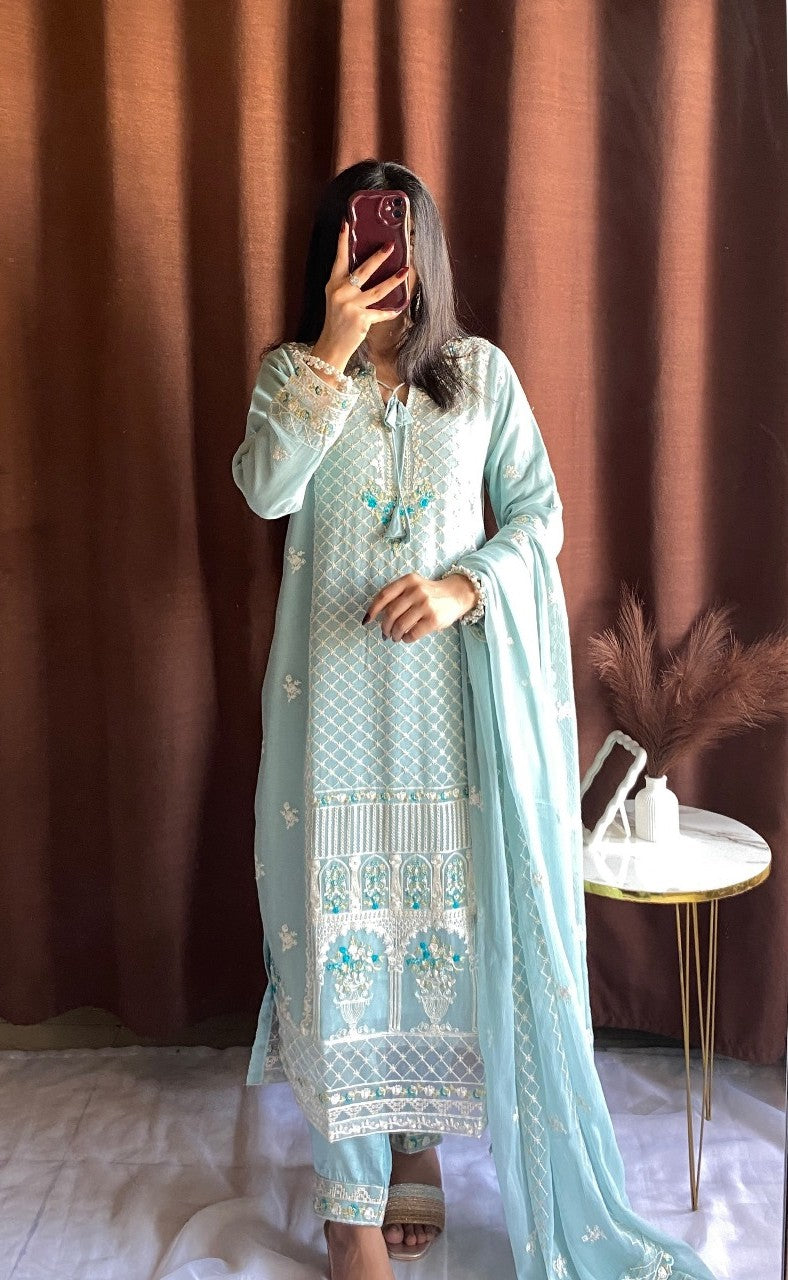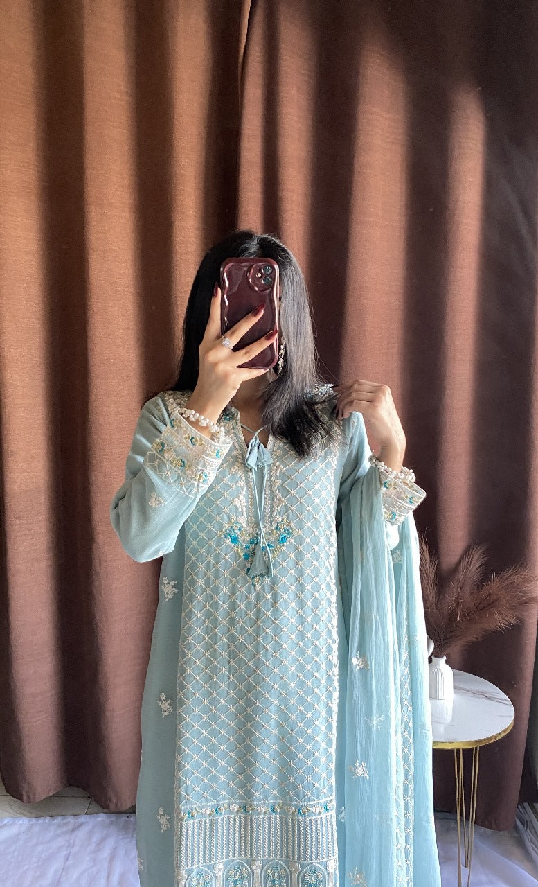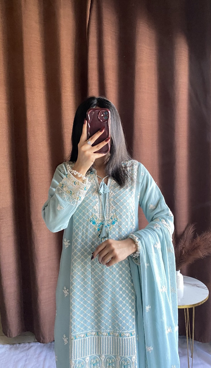 Shirt: Elegant Sky Blue chiffon with intricate thread embroidery, delicate sequins, and beadwork on neckline, sleeves, and hemline. Finished with lace detailing for a luxurious touch.