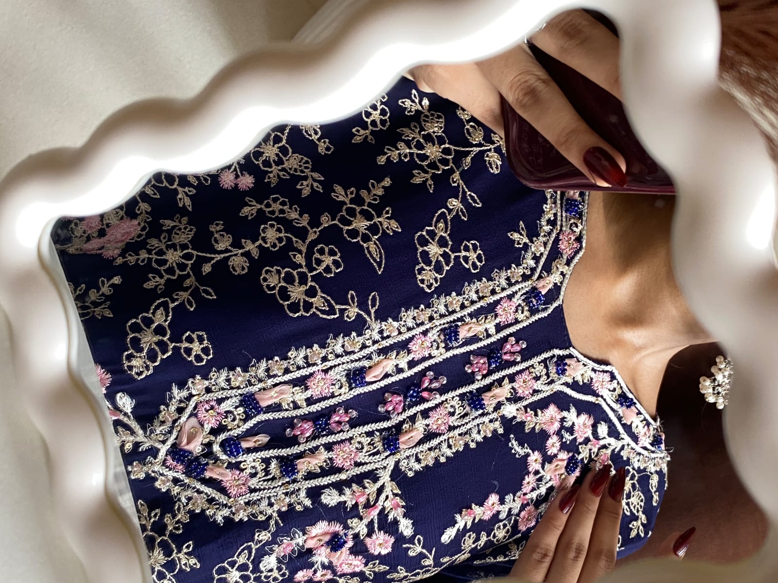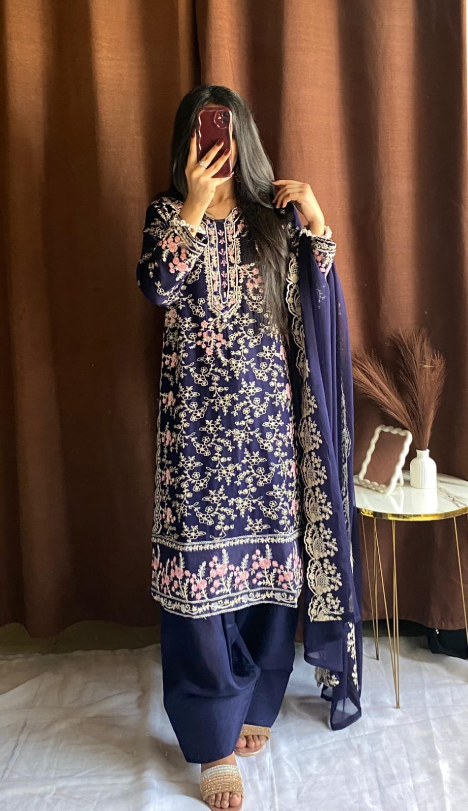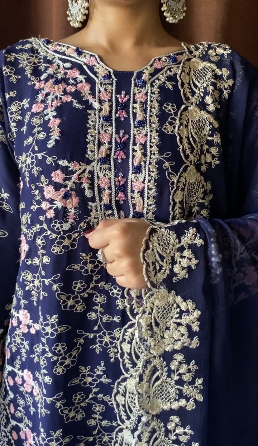 Shirt: Elegant Blue chiffon with intricate thread embroidery, delicate sequins, and beadwork on neckline, sleeves, and hemline. Finished with lace detailing for a luxurious touch.